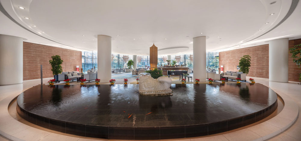 酒店中心的聆湖池是北大未名湖的缩影,恰如一方砚台,寓意酒店正书写辉煌的现在与将来。聆湖池中的翻尾石鱼口喷池水,寓意酒店生生不息,繁荣昌盛。 |